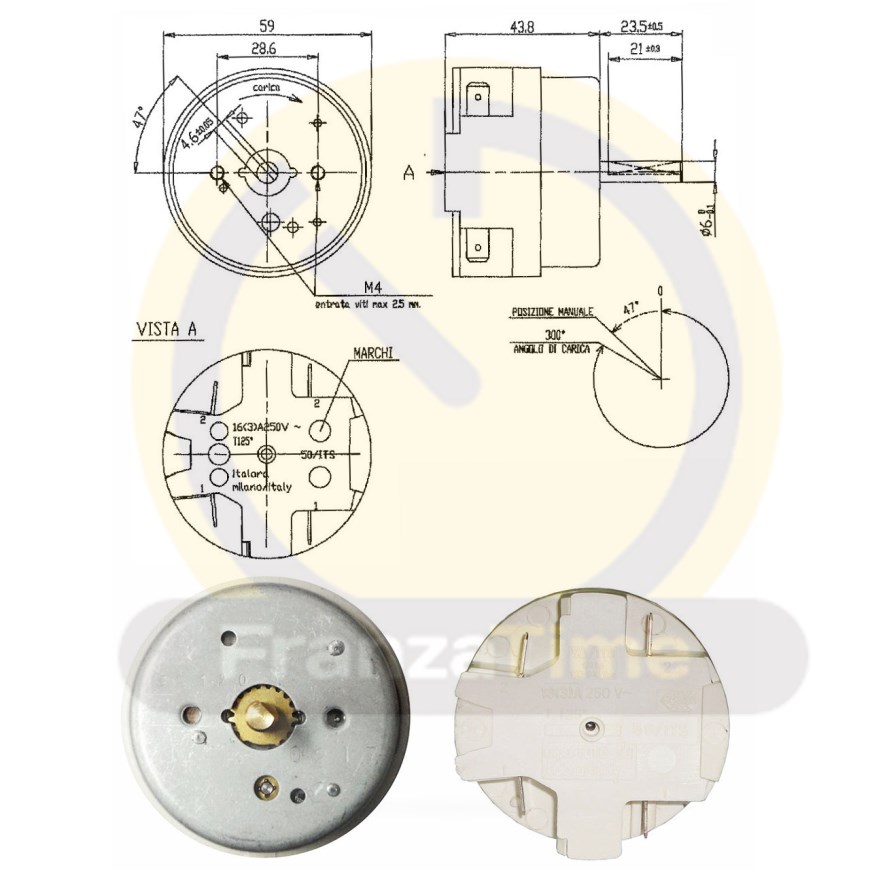 57.120.9.534.05.01 Temporizzatore timer 120 minuti monofresato - Interruttore a 2 vie ad apertura rapida con opzione di accensione non temporizzata (PM) - Perno Ø 6 x 4,5 mm. - Lunghezza perno 23,5 mm. - Portata 16A 250V - Temporizzazione 120' su 300° - Attacchi faston 6,3 x 0,8 mm. - Segnalazione acustica di fine ciclo 3 secondi - Entrata viti max 2,5 mm. (M4) - Temperatura d'impiego +125° PM = Posizione manuale con contatto chiuso,in posizione 0 contatto aperto Categoria: ITS 55 - 56 - 57 Vedi anche... ITS 55 - 56 - 57 56.030.9.531.01 Dettagli ITS 55 - 56 - 57 56.060.9.531.01 Dettagli ITS 55 - 56 - 57 56.120.9.531.01.01 Dettagli ITS 55 - 56 - 57 57.030.9.531.05 Dettagli ITS 55 - 56 - 57 57.060.9.531.05 Dettagli ITS 55 - 56 - 57 57.120.9.011.05.01 Dettagli ITS 55 - 56 - 57 57.120.9.531.05.01 Dettagli ITS 55 - 56 - 57 57.120.9.703.05.01 Dettagli ITS 55 - 56 - 57 57.120.9.911.05.01 Dettagli Precedente Lista Altre info Successivo